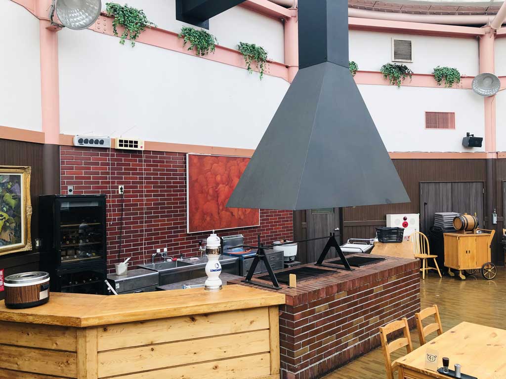 ドーム形の屋根が特徴で、レストランからは木々が眺められ、売店には冷蔵ショーケースが並びます。ウィンナーの手作り体験ができる道具もそろっています。