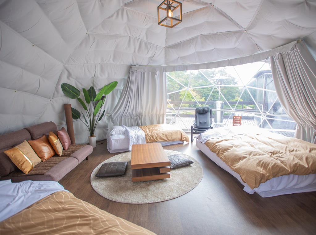 独立型テントや洗練された屋外空間、焚き火エリアなど多彩なシーン演出が可能で、四季折々のロケーションが魅力。