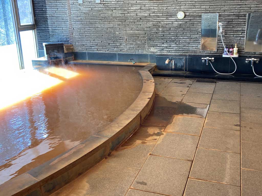 森の中の温泉ホテル。北欧のシャトーやスペインのパラドールを思わせる、石と木を組み合わせた重厚な建物で、暖炉のある吹き抜けのロビーラウンジが印象的です。体育館やオートキャンプ場もあります。