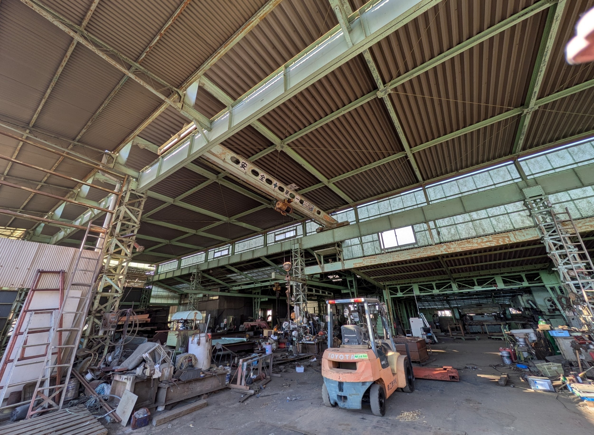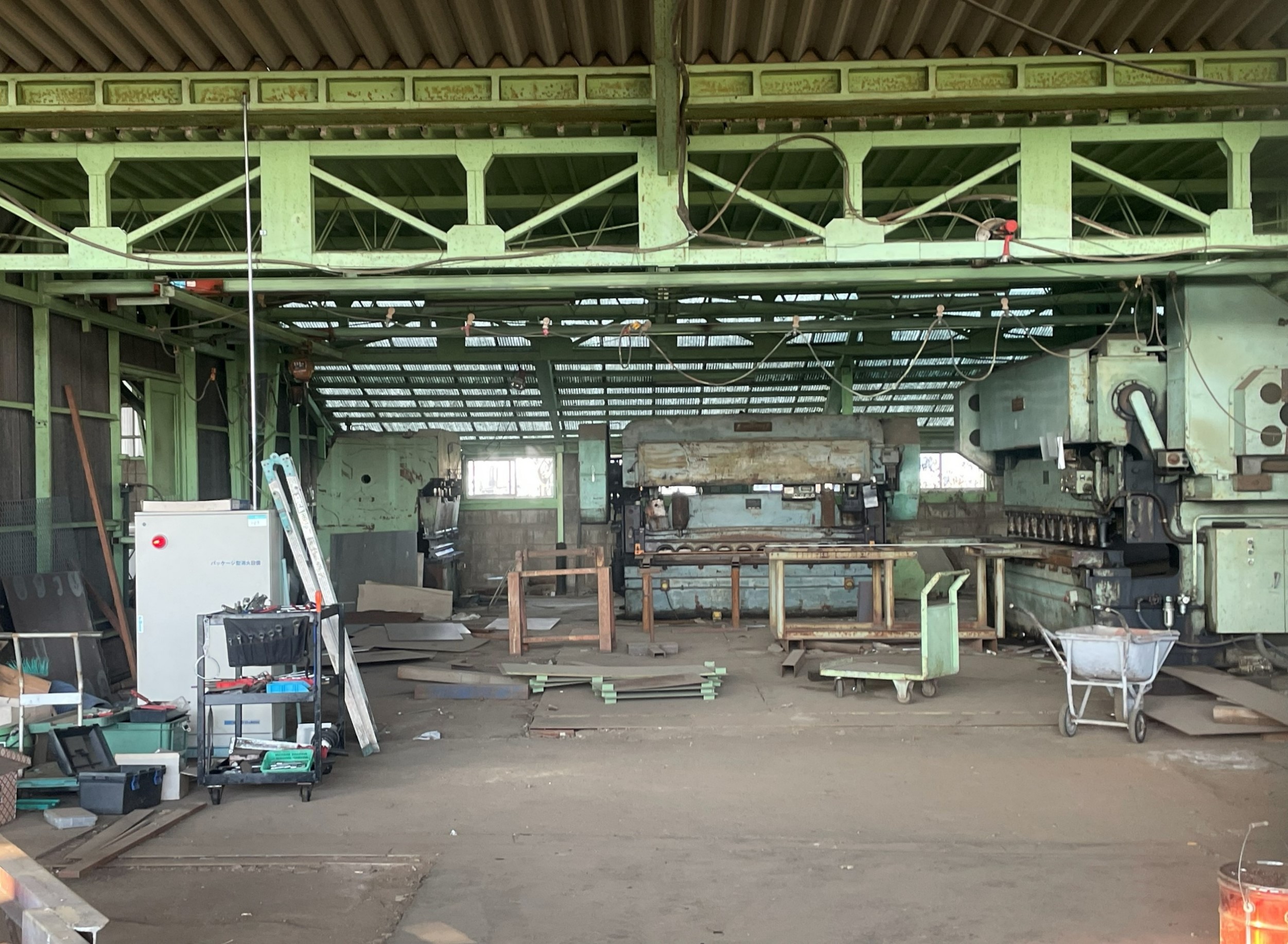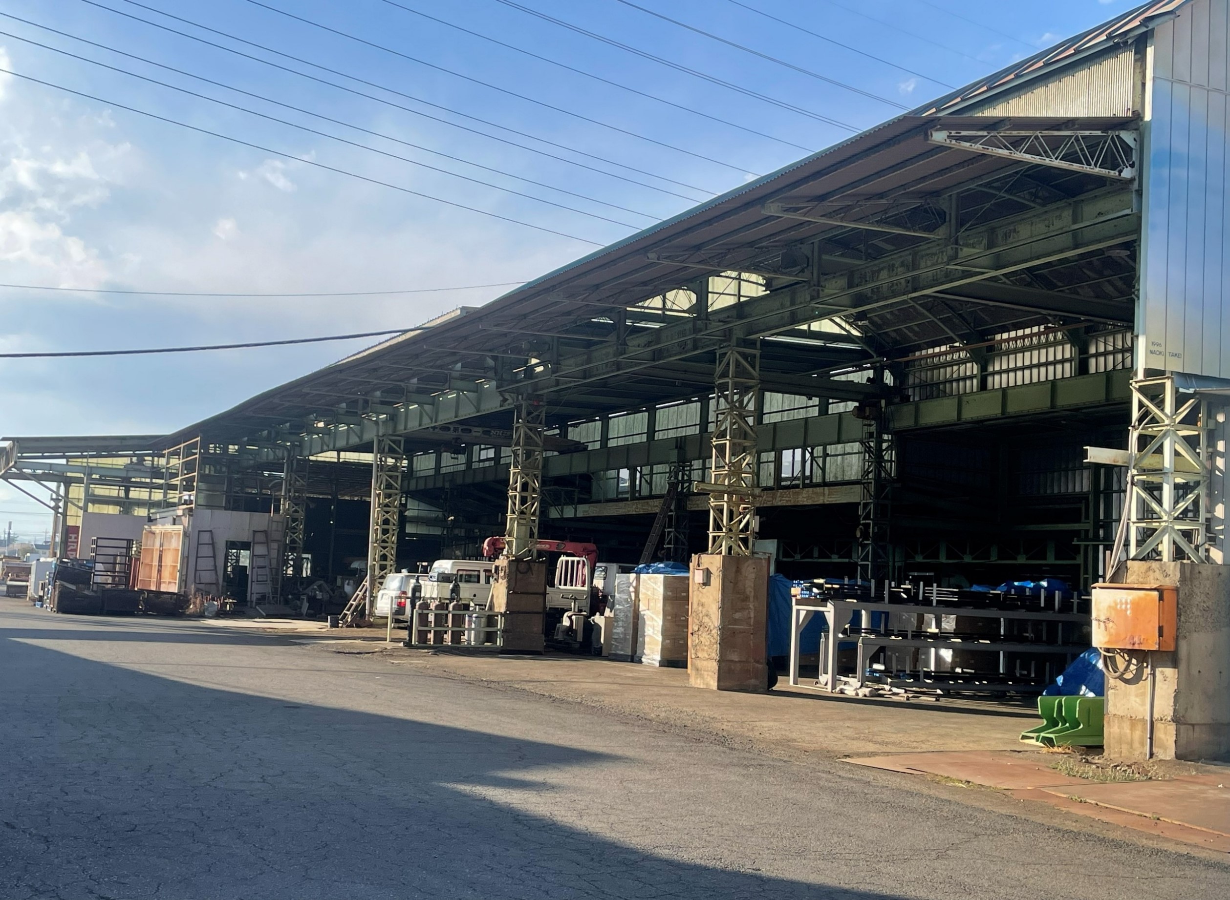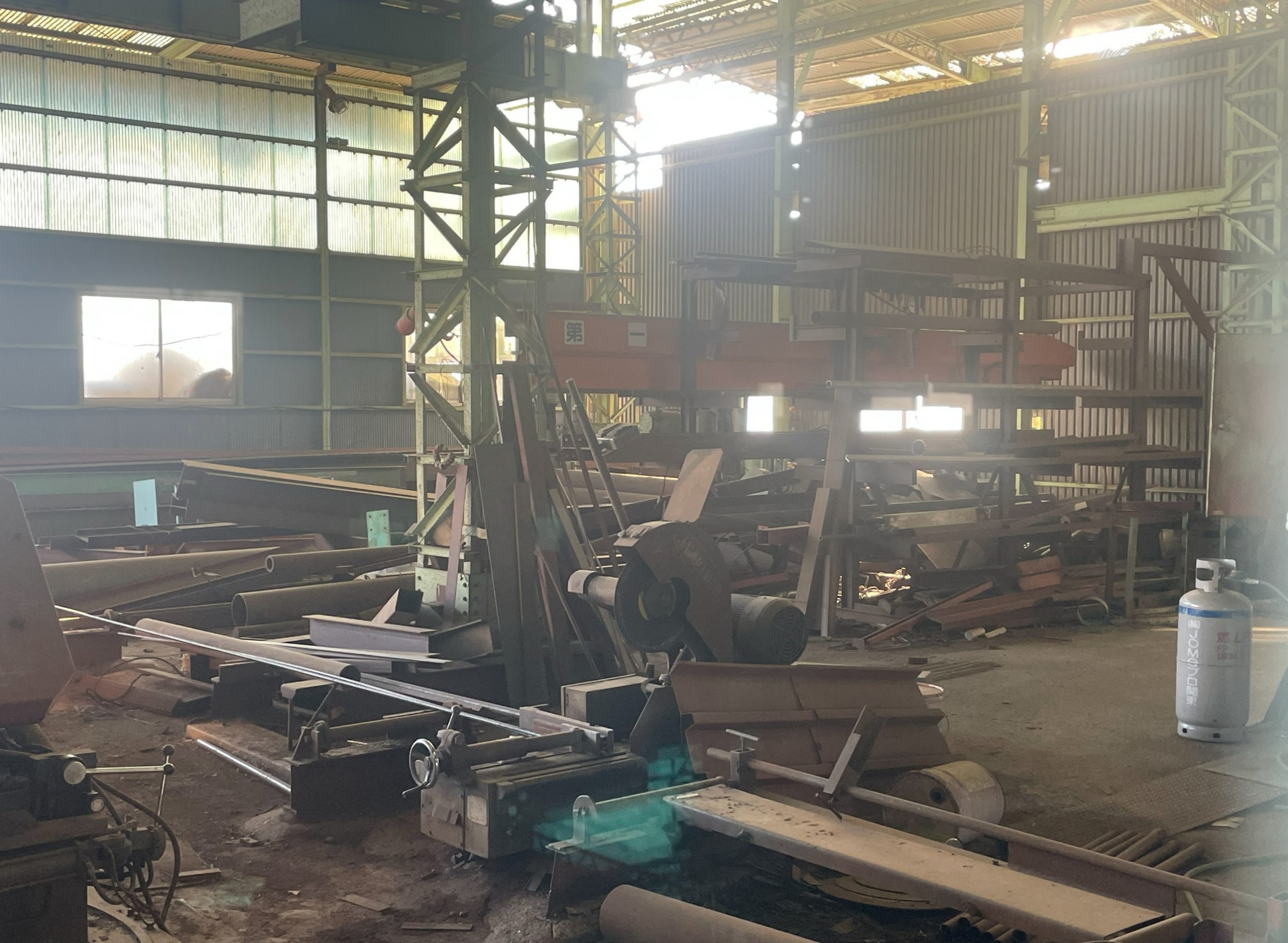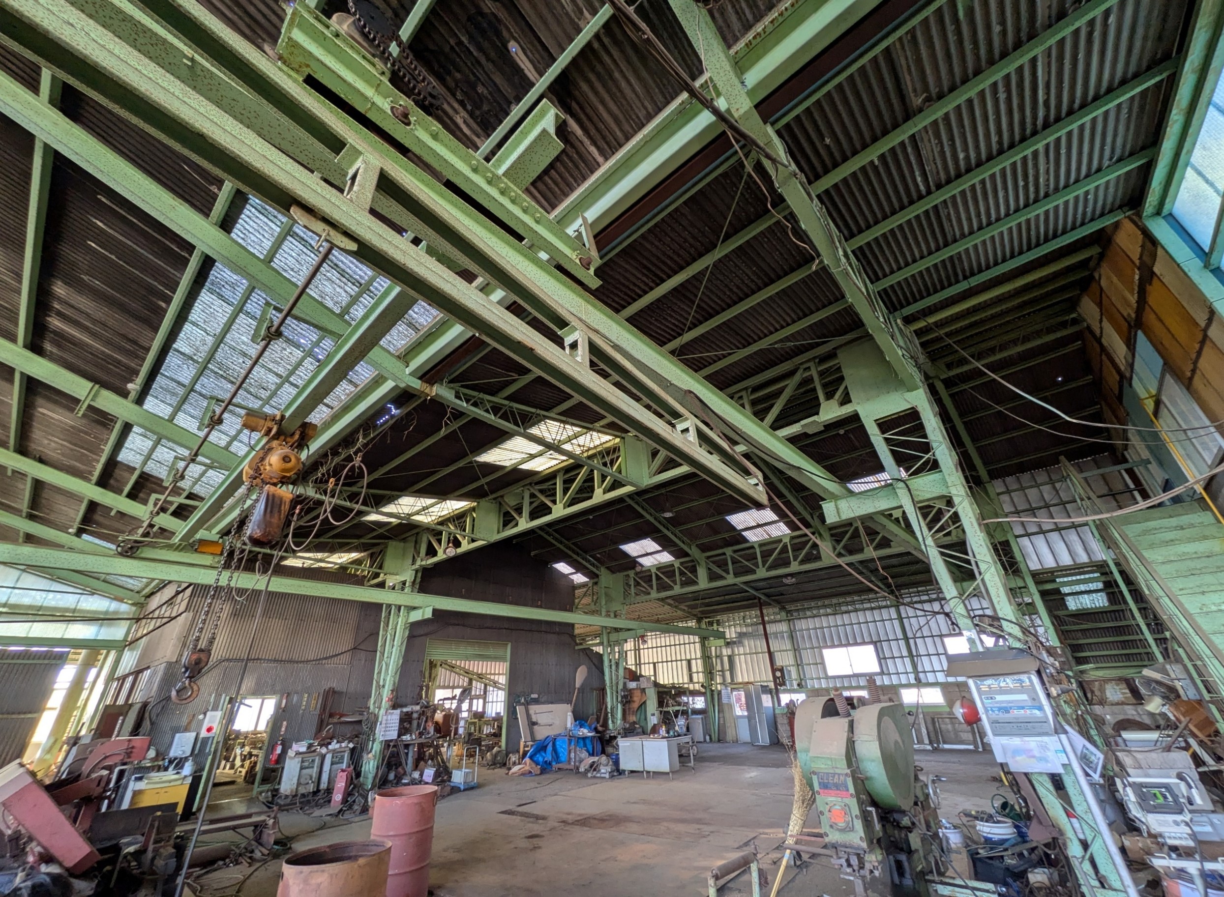 鉄骨むき出しの構造と広い作業空間が特徴で、昭和の雰囲気を色濃く残しています。鋼材や加工設備が並ぶ実稼働中の工場で、リアリティのある工場シーンの撮影に適しています。